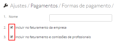 Ao marcar ou desmarcar as caixas de seleção nos pontos 2 e 3, decida se o método de pagamento será incluído no faturamento da empresa e no faturamento e comissões de profissionais (uma caixa de seleção marcada significa que a forma de pagamento será incluída na receita):