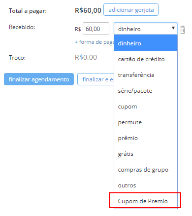 A partir deste momento você vai poder escolher esta forma de pagamento ao finalizar um agendamento (no menu suspenso da lista de formas de pagamento):